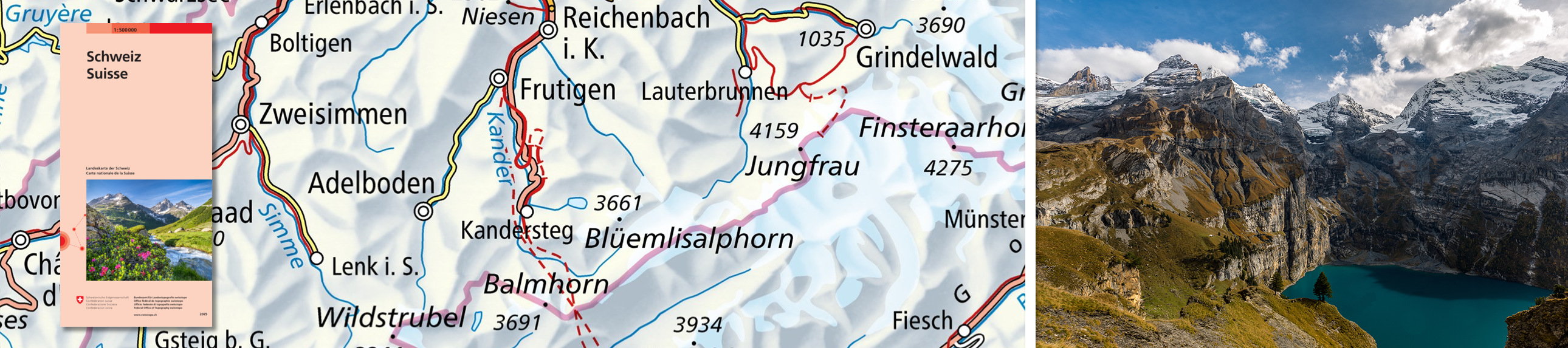 Small scale, large overview. The precise topographical map shows the entire territory of Switzerland and its neighbouring foreign countries. It shows the complete railway network as well as freeways, highways and major roads.